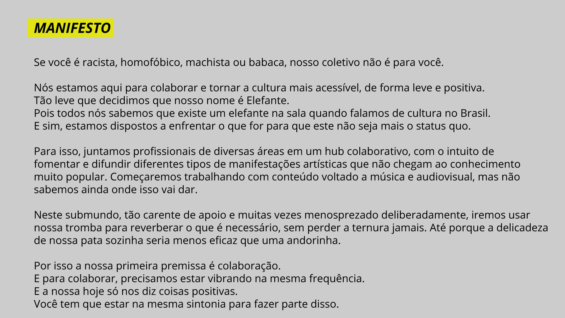 elefante é um coletivo criativo que visa fomentar projetos culturais, preferencialmente musicais.